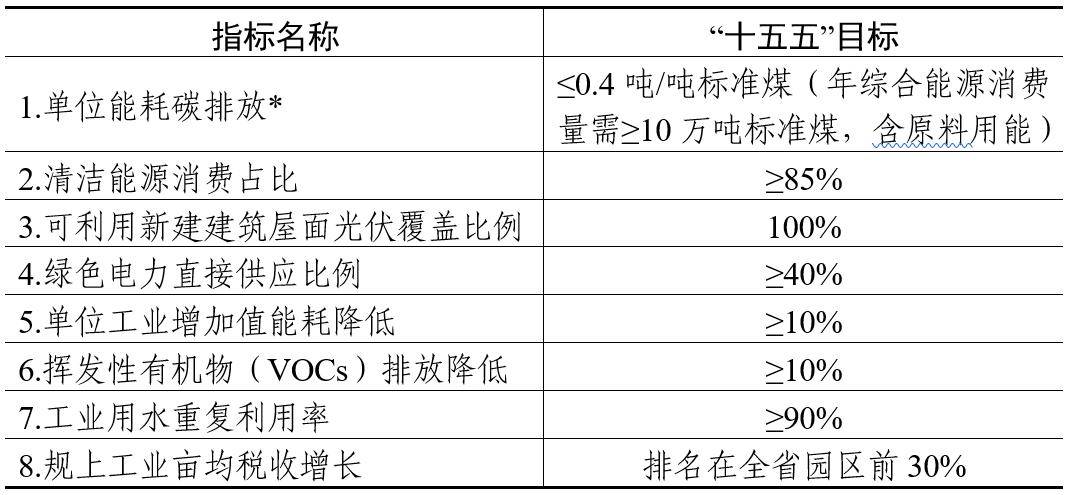 低碳园区指标如表1所示,表中“十五五”目标为全部园区整体上要达到的目标,各园区须因地制宜、“一园一策”突出符合实际的自身目标。其中,碳排放量大于1000万吨且碳排放强度高于全省规上工业平均(1.68吨/万元)的园区,单位工业增加值碳排放降低目标不低于22%;碳排放量在100~1000万吨且碳排放强度高于全省规上工业平均(1.68吨/万元)的园区,目标不低于20%;其他园区目标不低于18%。